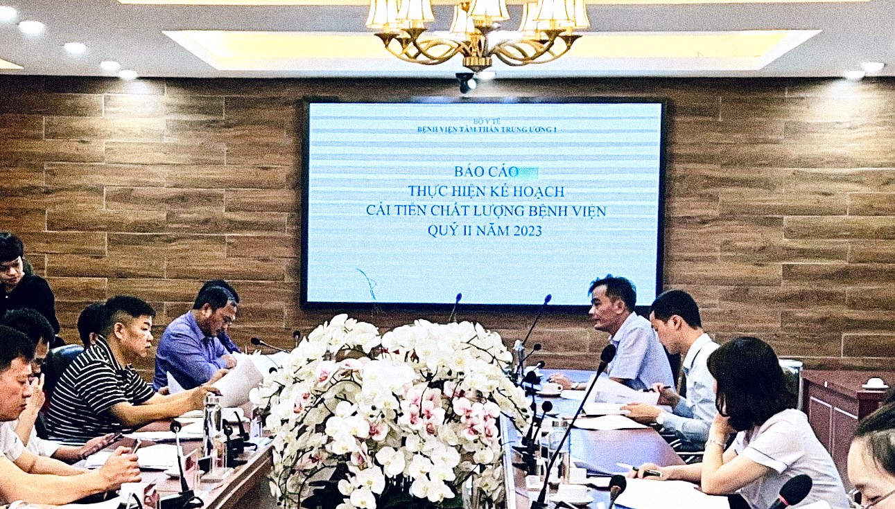 Ngày 28/06/2023 Bệnh viện Tâm thần Trung ương 1 tổ chức buổi họp định kỳ báo cáo tiến độ thực hiện, công tác cải tiến chất lượng theo Kế hoạch số 123/KH-BV ngày 28/3/2023. Dự buổi họp có các đồng chí trong Hội đồng Quản lý chất lượng, Lãnh đạo các đơn vị là đầu mối tham gia thực hiện, triển khai Kế hoạch cải tiến chất lượng bệnh viện năm 2023. Chủ trì cuộc họp TS.BS. Nguyễn Mạnh Phát – Phụ trách điều hành Bệnh viện – Chủ tịch HĐ QLCL.