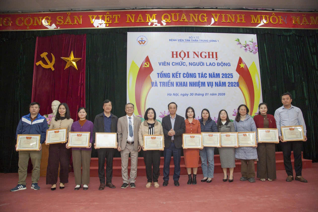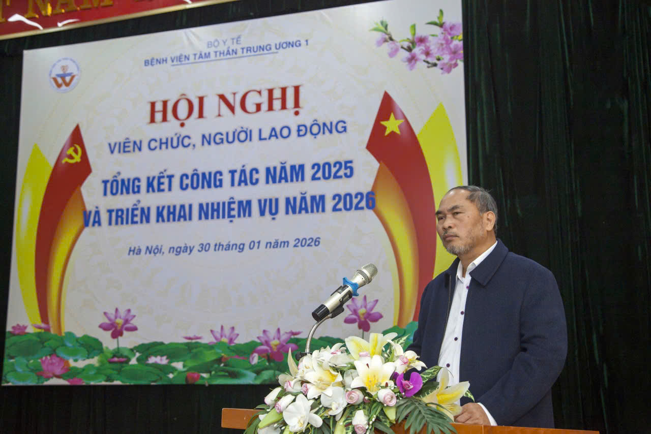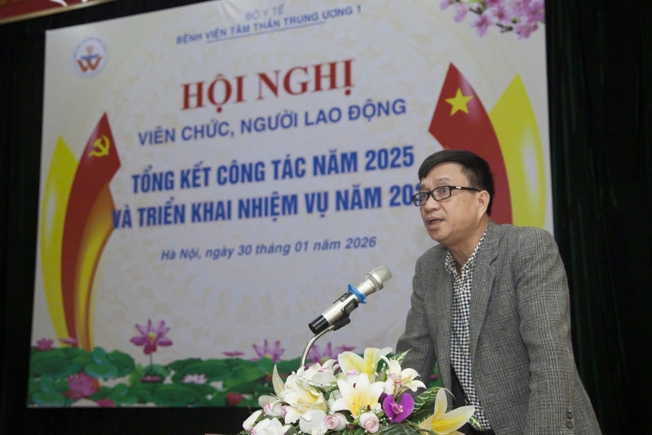 Sáng ngày 30/01/2026, Bệnh viện Tâm thần Trung ương 1 long trọng tổ chức Hội nghị viên chức và người lao động, tổng kết công tác năm 2025 và triển khai nhiệm vụ năm 2026. Tham dự và chủ trì Hội nghị có TS.BS. Nguyễn Mạnh Phát, Bí thư Đảng ủy, Giám đốc Bệnh viện; TS. Lê Ngọc Tú, Thường vụ Đảng ủy, Phó Giám đốc Bệnh viện; BS.CKII. Nguyễn Tuấn Đại, Đảng ủy viên, Phó Giám đốc Bệnh viện; BS.CKII. Nguyễn Chí Thành, Đảng ủy viên, Phó Giám đốc Bệnh viện; ĐD.CKI. Hoàng Việt Hà, Chủ tịch Công đoàn Bệnh viện và hơn 200 viên chức, người lao động tiêu biểu đại diện cho các đơn vị khoa, phòng, trung tâm trong toàn Bệnh viện tham dự.