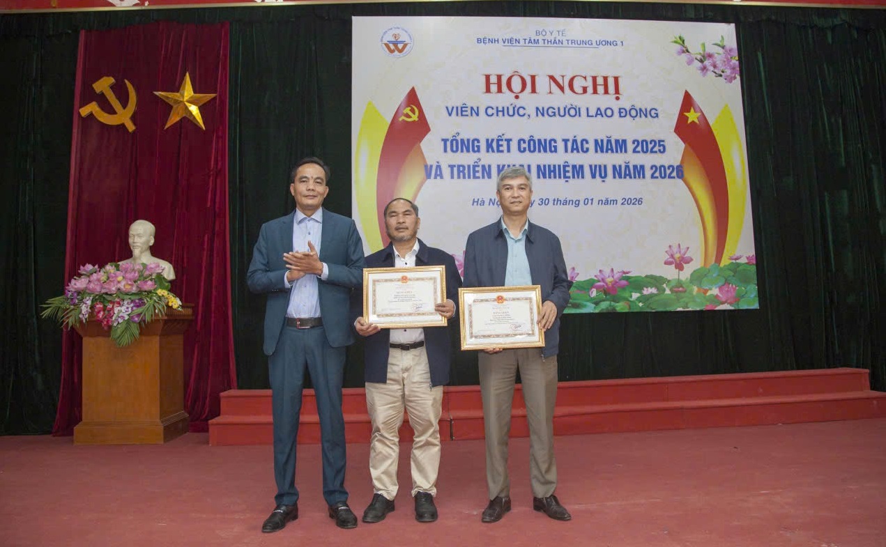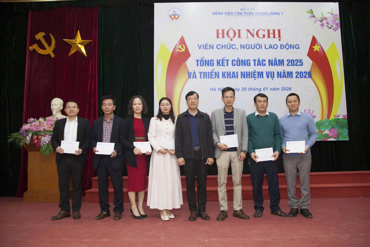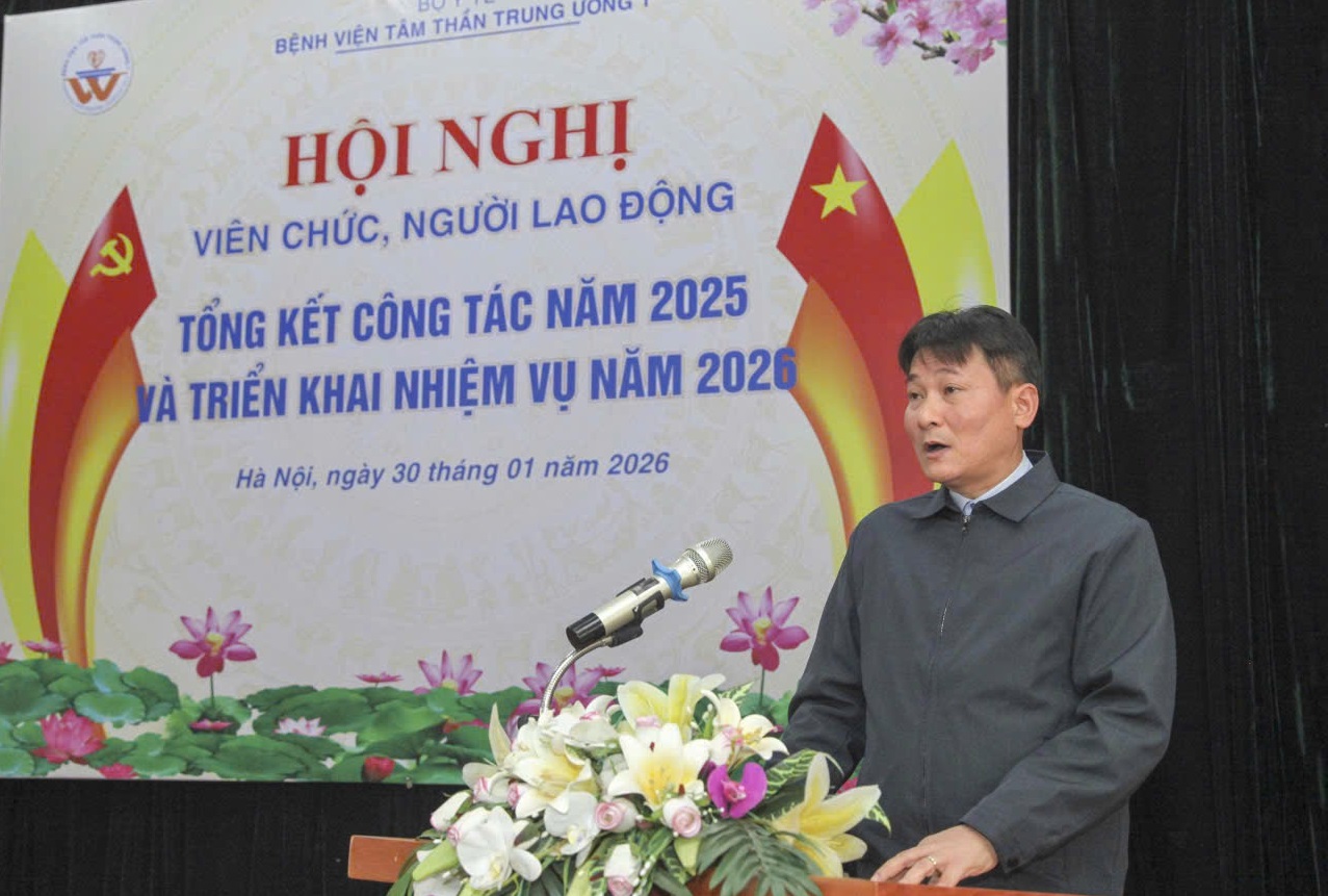 Sáng ngày 30/01/2026, Bệnh viện Tâm thần Trung ương 1 long trọng tổ chức Hội nghị viên chức và người lao động, tổng kết công tác năm 2025 và triển khai nhiệm vụ năm 2026. Tham dự và chủ trì Hội nghị có TS.BS. Nguyễn Mạnh Phát, Bí thư Đảng ủy, Giám đốc Bệnh viện; TS. Lê Ngọc Tú, Thường vụ Đảng ủy, Phó Giám đốc Bệnh viện; BS.CKII. Nguyễn Tuấn Đại, Đảng ủy viên, Phó Giám đốc Bệnh viện; BS.CKII. Nguyễn Chí Thành, Đảng ủy viên, Phó Giám đốc Bệnh viện; ĐD.CKI. Hoàng Việt Hà, Chủ tịch Công đoàn Bệnh viện và hơn 200 viên chức, người lao động tiêu biểu đại diện cho các đơn vị khoa, phòng, trung tâm trong toàn Bệnh viện tham dự.