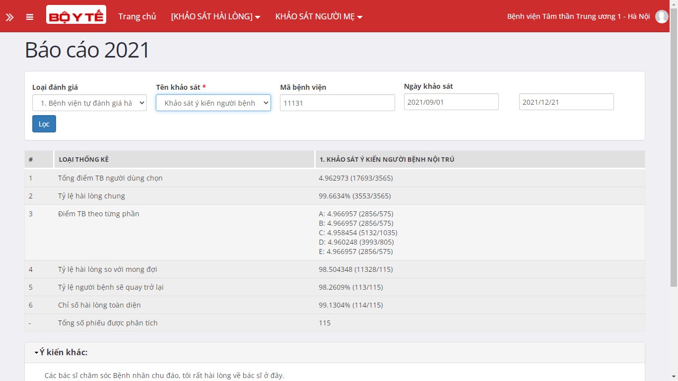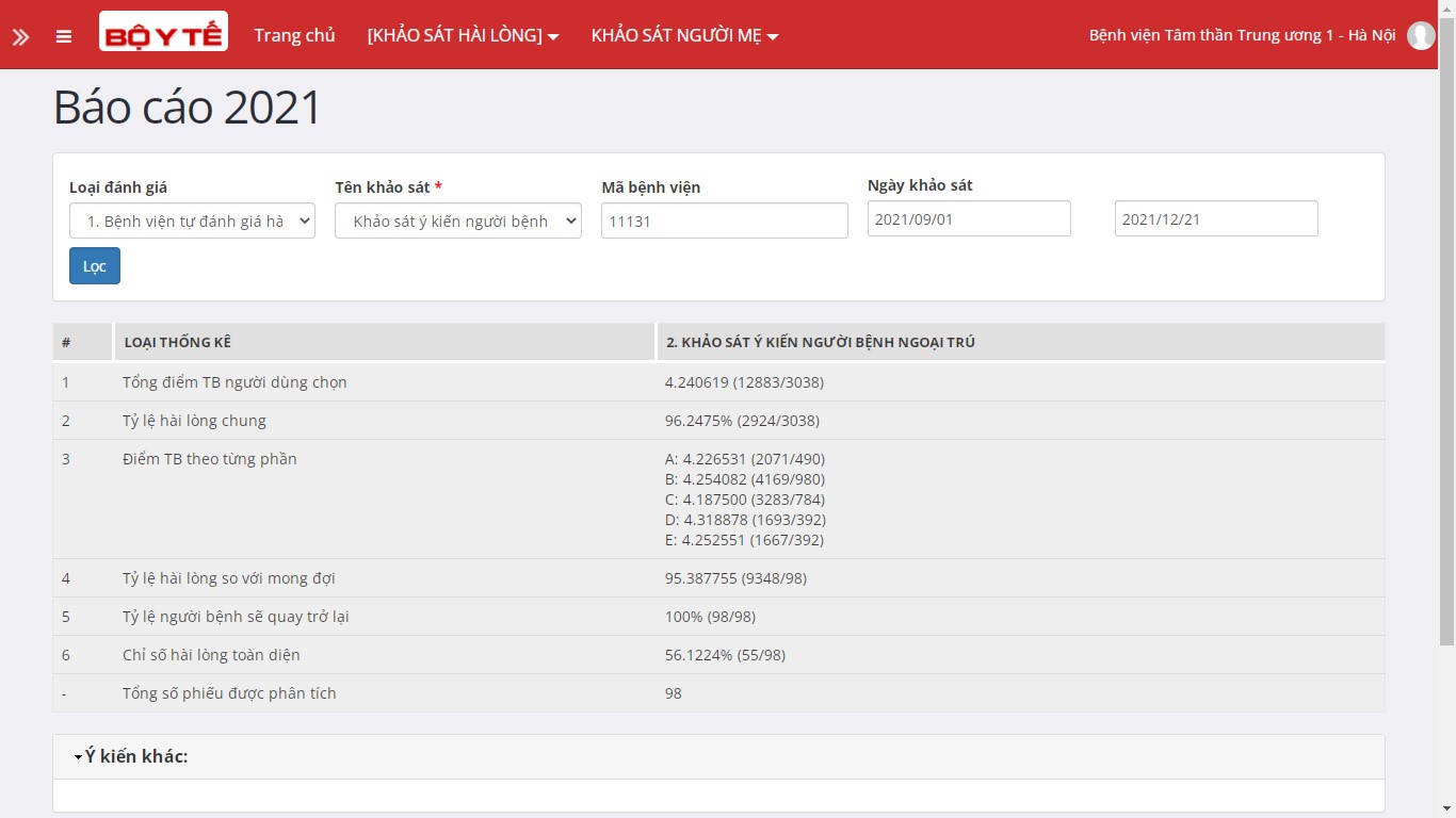 Qua kết quả khảo sát sự hài lòng người bệnh nội, ngoại trú cuối năm 2021 trên trang thông tin của Bộ Y Tế vừa qua có thể thấy tỷ lệ hài lòng người bệnh khi đến khám, chữa bệnh tại Bệnh viện là rất cao.