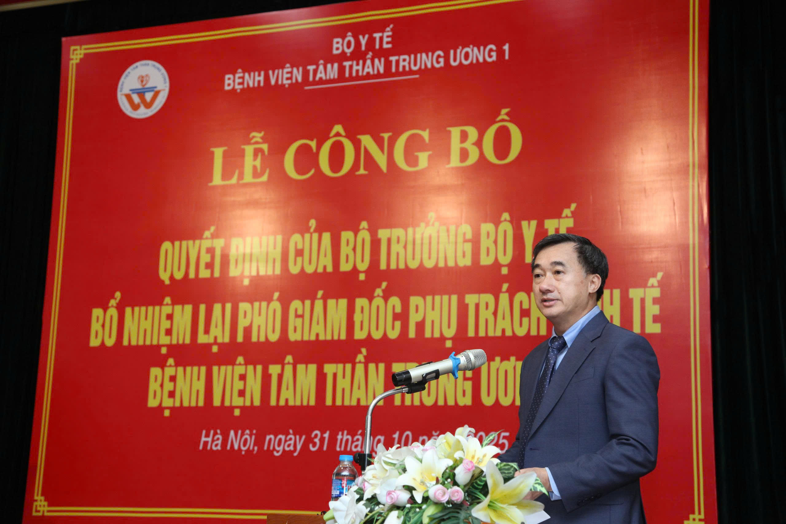 Tại buổi lễ, ThS. Lê Lan Hương, Phó Vụ trưởng Vụ Tổ chức cán bộ đã công bố Quyết định số 2980/QĐ-BYT ngày 22/9/2025 của Bộ trưởng Bộ Y tế về việc bổ nhiệm lại chức vụ Phó Giám đốc phụ trách kinh tế Bệnh viện Tâm thần Trung ương 1 đối với TS. Lê Ngọc Tú.