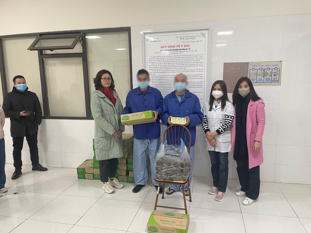 Đ/c Đỗ Ánh Quyên – Trưởng khoa Dinh dưỡng và Đ/c Vương Đình Khoa – Trưởng phòng CTXH trao quà cho người bệnh các khoa lâm sàng.