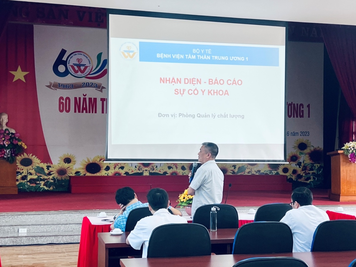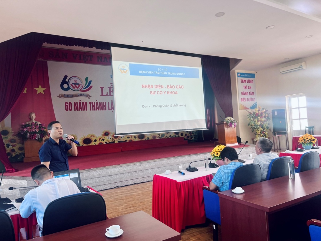 Nhằm chia sẻ kinh nghiệm, cập nhật kiến thức cho Nhân viên y tế biết nhận diện, xử lý, báo cáo được những Sự cố y khoa trong quá trình hoạt động khám bệnh, chữa bệnh, cung cấp dịch vụ y tế cho người bệnh, ngày 5/7/2023 trong buổi Sinh hoạt khoa học tại Bệnh viện Tâm thần Trung ương 1 – Phòng Quản lý chất lượng Bệnh viện đã có bài báo cáo: “ Nhận diện – Báo cáo sự cố y khoa”